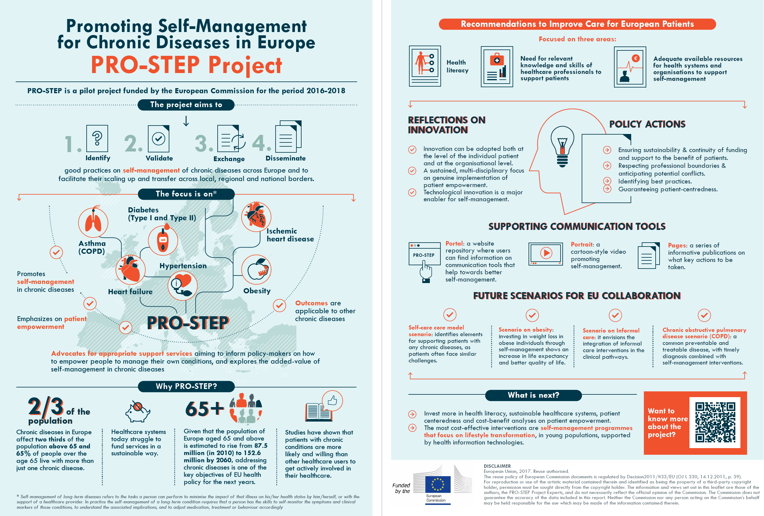 PRO-STEP is a pilot project focusing on self-management in chronic conditions. While this shares some similarities with self-care in minor conditions, such as the importance of health literacy, there are important differences as chronic disease requires a long-term approach with emphasis on patient empowerment and appropriate support services.